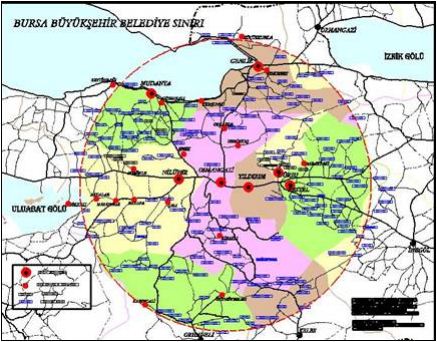 Hızlı sanayileşme, göç ve nüfus artışı beraberinde çevre kirliliği, kaçak yapılaşma, işsizlik, suç oranının artması gibi dünyanın büyük metropollerine özgü birçok kentsel sorunu da doğurmuştur. Bu sorunlarla mücadele etmek için 1990’larda başlayan bir hareketle yerel, ulusal ve uluslararası kaynaklardan yararlanarak içme suyu, kanalizasyon, ulaşım, eğitim, çevre kirliliği, güvenlik, sağlık ve istihdam gibi konularda önemli adımlar atılmaya başlanmıştır. Bursa 17 ilçeye sahip bir il merkezidir. Bursa’ya ait ilçeler sırasıyla; Nilüfer, Osmangazi, Yıldırım, Büyükorhan, Gemlik, Gürsu, Harmancık, inegöl, İznik, Karacabey, Keles, Kestel, Mudanya, M. Kemalpaşa Orhaneli, Orhangazi, Yenişehir’dir. Bu ilçelerden Nilüfer, Osmangazi, Yıldırım Büyükşehir Belediyesi’ni oluştururken 5216 sayılı “Büyükşehir yasası” kapsamında Gemlik, Gürsu, Kestel, Mudanya ilçeleri de Büyükşehir Belediyesi sınırlarına dahil olmuştur.