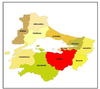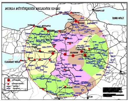 Bursa 17 ilçeye sahip bir il merkezidir. Bursa‟ya ait ilçeler sırasıyla; Nilüfer, Osmangazi, Yıldırım, Büyükorhan, Gemlik, Gürsu, Harmancık, inegöl, İznik, Karacabey, Keles, Kestel, Mudanya, M. Kemalpaşa Orhaneli, Orhangazi, Yenişehir‟dir. Bu ilçelerden Nilüfer, Osmangazi, Yıldırım Büyükşehir Belediyesi‟ni oluştururken 5216 sayılı “BüyükŞehir yasası” kapsamında Gemlik, Gürsu, Kestel, Mudanya ilçeleri de Büyükşehir Belediyesi sınırlarına dahil olmuştur.