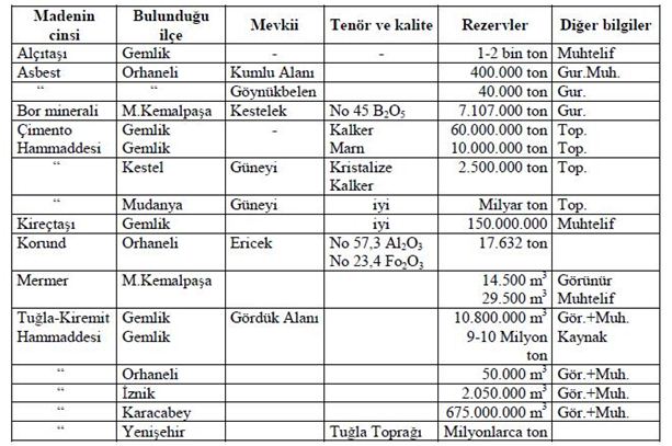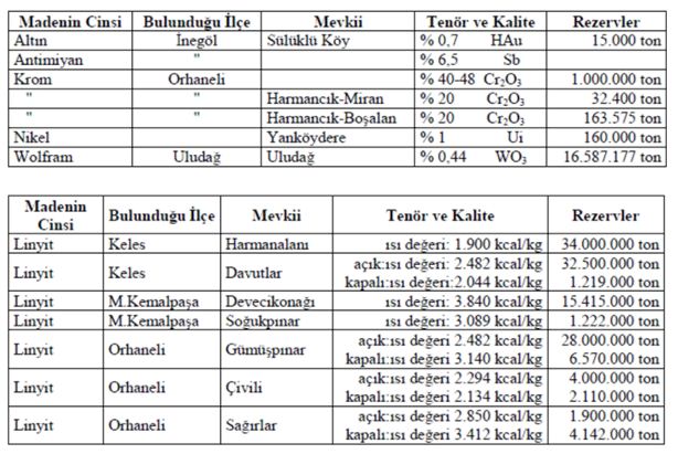 Ekonomik yönden faal olan Bursa nüfusunun % 0,5’ini oluşturan 3215 kişi Madencilik sektöründe çalışmaktadır. ilin güney, güneybatı ve güneydoğusunda birçok maden yatağı bulunmaktadır. Bu maden yatakları, magmatik kayaçların etrafında yaslı metamorfik birimler içinde yer almaktadır.