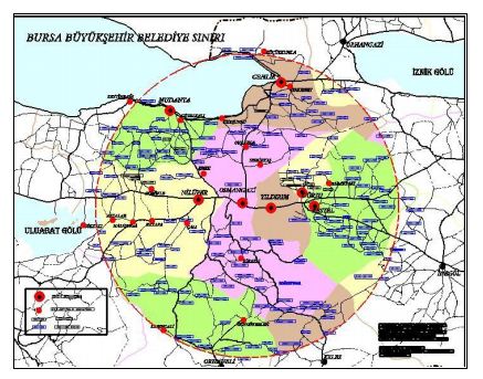 Bursa 17 ilçeye sahip bir il merkezidir. Bursa‟ya ait ilçeler sırasıyla; Nilüfer, Osmangazi, Yıldırım, Büyükorhan, Gemlik, Gürsu, Harmancık, inegöl, iznik, Karacabey, Keles, Kestel, Mudanya, M. Kemalpaşa Orhaneli, Orhangazi, Yenişehir‟dir. Bu ilçelerden Nilüfer, Osmangazi, Yıldırım Büyükşehir Belediyesi‟ni oluştururken 5216 sayılı “Büyükşehir yasası” kapsamında Gemlik, Gürsu, Kestel, Mudanya ilçeleri de Büyükşehir Belediyesi sınırlarına dahil olmuştur.