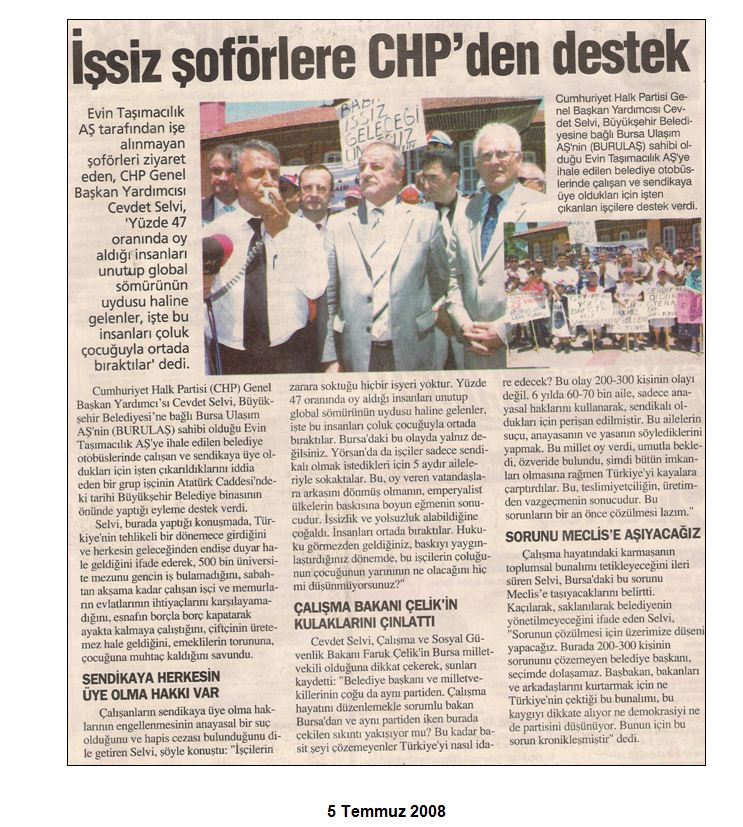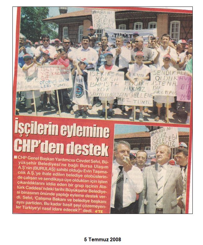 - Büyükşehir Belediyesi’nde çalışan sendikalı işçilerin işten çıkarılması üzerine düzenlenen mitinge, CHP Genel Başkan Yardımcısı Milletvekili Sn. Cevdet SELVİ ile birlikte katılım sağlandı, Basın Açıklaması ile işçilerin eylemine destek verildi.