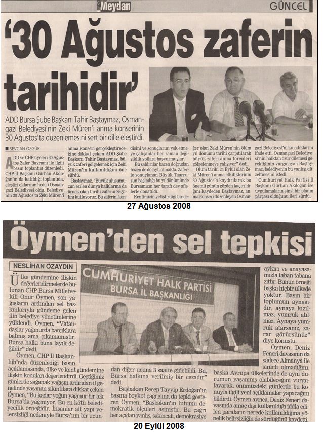 - 30 Ağustos Zafer Bayramı’nda; Osmangazi Belediyesi’nin (Zafer Bayramı Töreni ile ilgili olmayan ) Zeki MÜREN’i anma töreni düzenlemesine ilişkin tepkilerimizin ortaya koyulması üzerine programın iptali sağlandı.