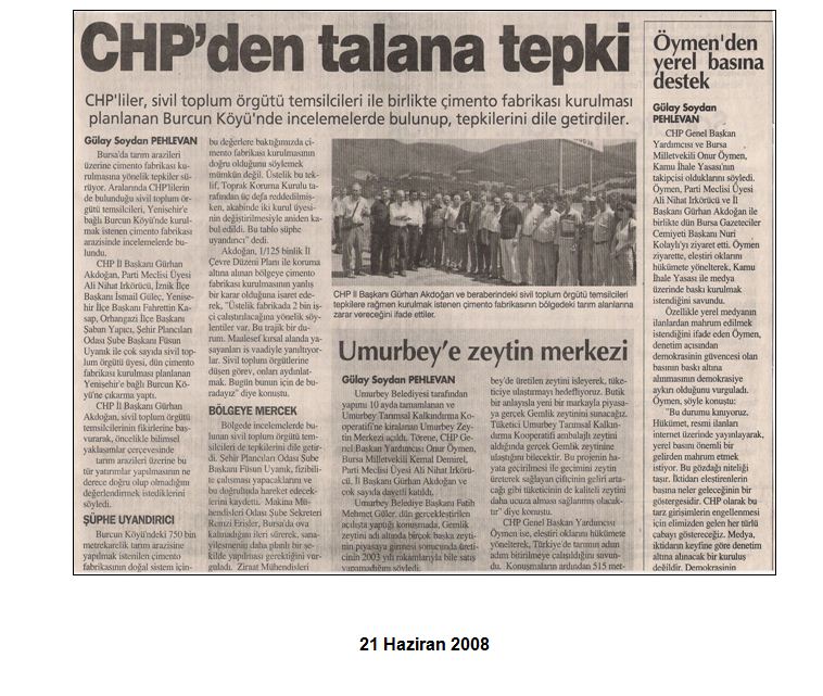 - Tarım alanlarının sanayiye açılması konusunda , tarım alanlarının amaç dışı kullanılmasına ve Yenişehir (Burcun), Karacabey (Şahinköy) ve Bursa ovasında (Turanköy) yapılmak istenilen Çimento Fabrikalarına karşı mücadele edildi.